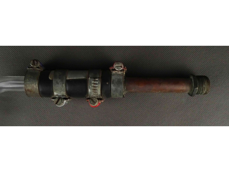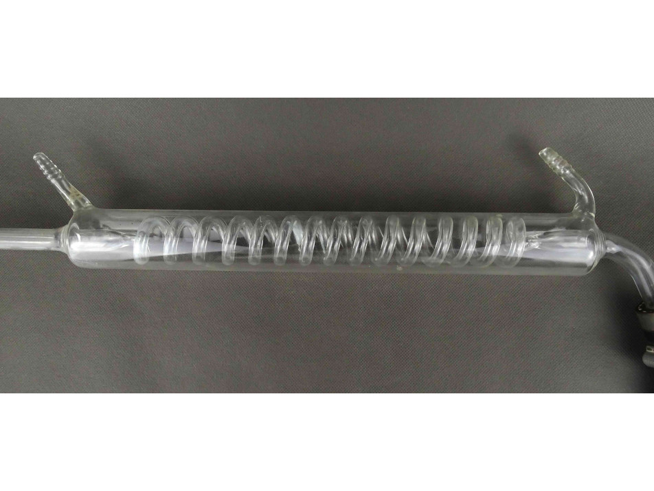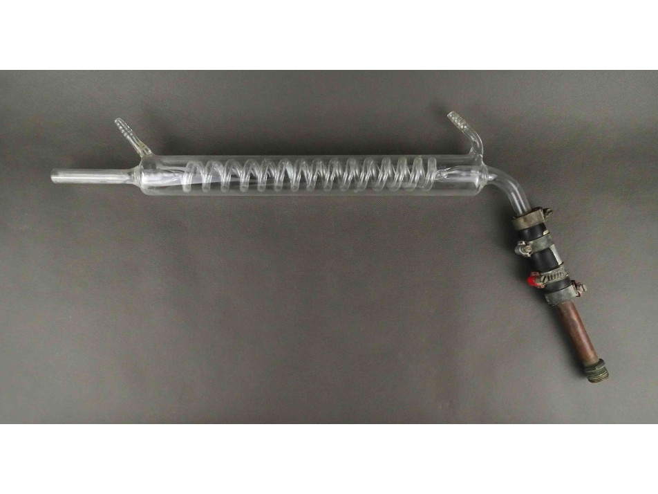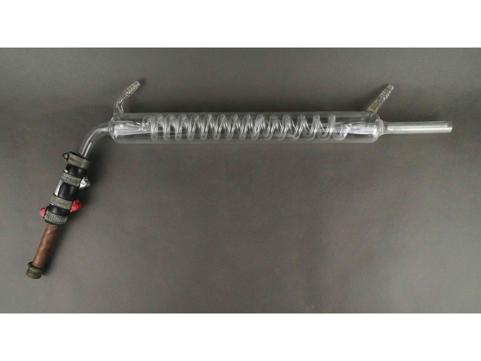 Régi, nagyméretű laboratóriumi üveg, spirál hűtő, desztilláló szerkezet. Az eszköz egyik szárához egy réz szerkezetet kapcsoltak, ami könnyedén lebontható róla.