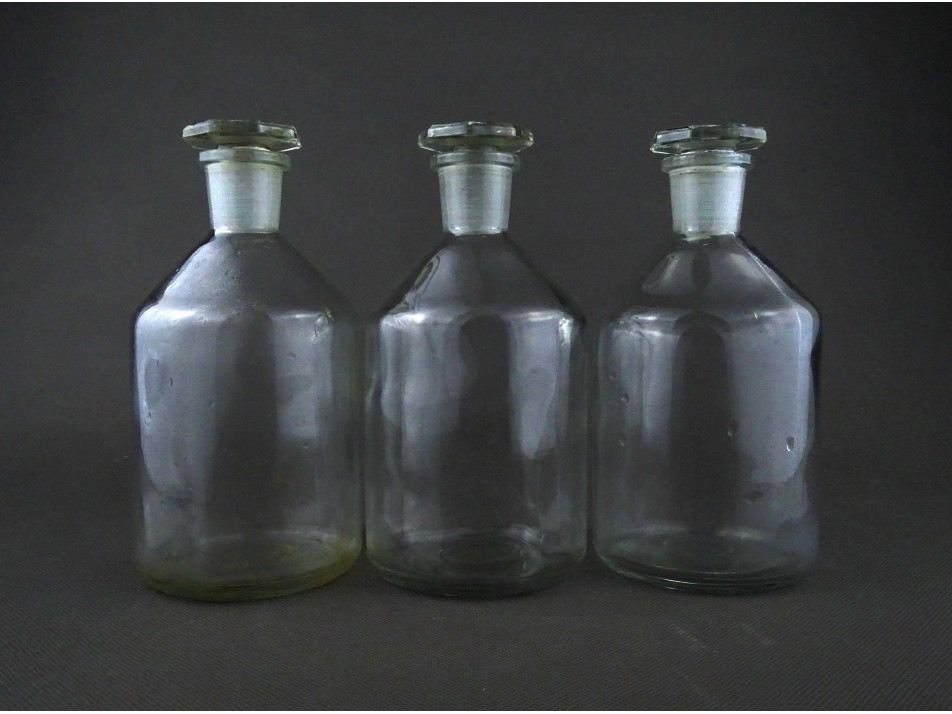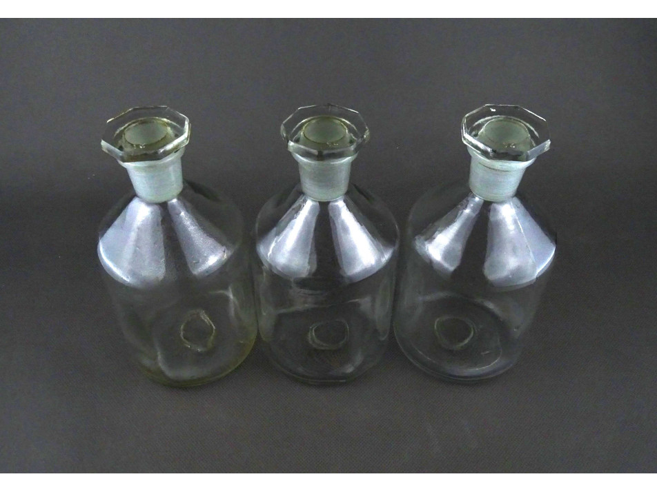 Régi, hibátlan állapotú, áttetsző, csiszolt dugós patika üveg, gyógyszerészeti tároló üveg csomag, három darab egyben. Aljukon felirat: 500