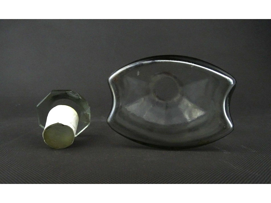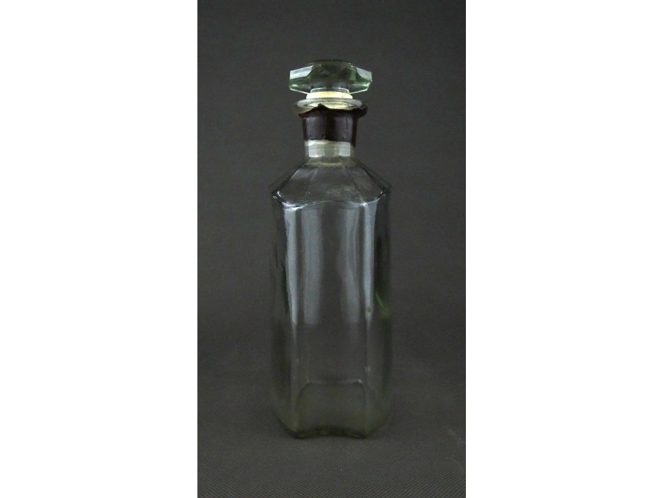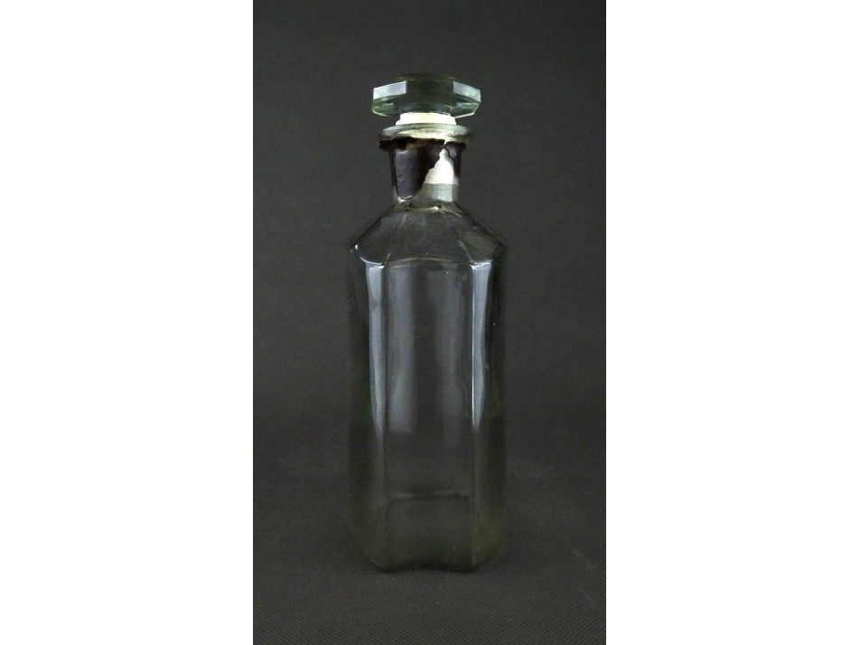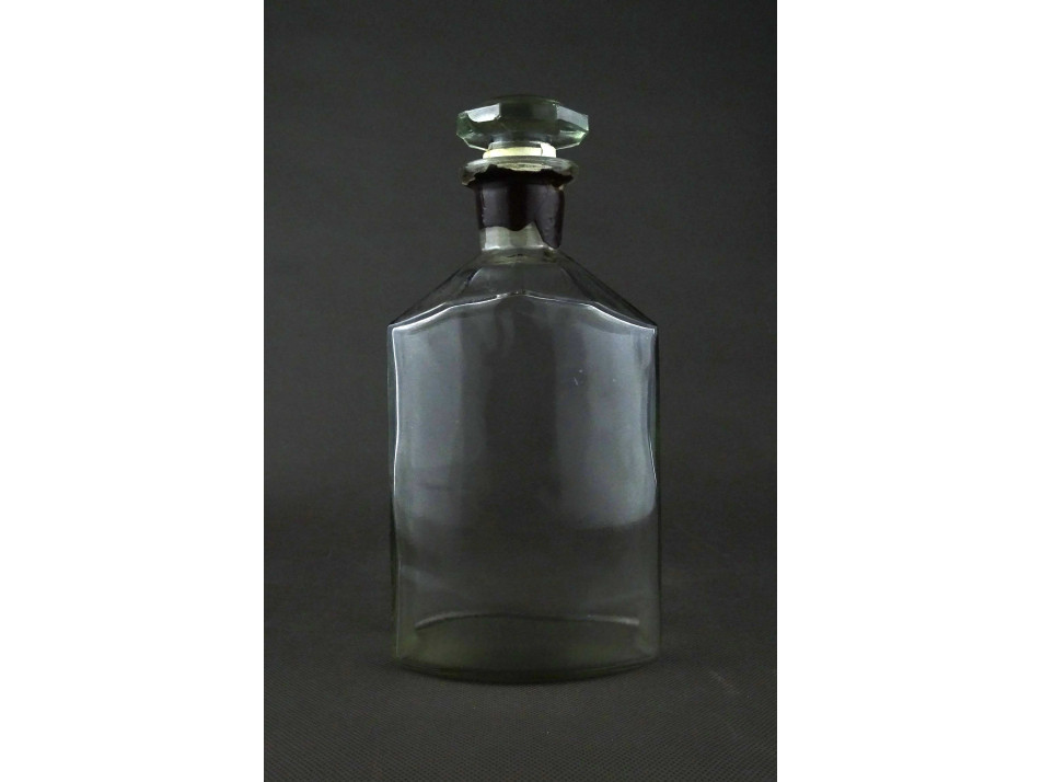 Régi, szép állapotú, nagyméretű, csiszolt dugós, felirat nélküli gyógyszertári üveg, patikaüveg. Nyakán pecsétviasz maradvány, a dugó alsó peremén két lepattanás látható.