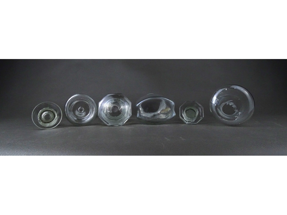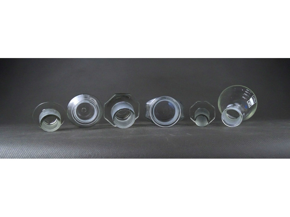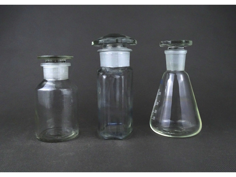 Régi, hibátlan állapotú, különböző méretű, csiszolt dugós laboratóriumi üveg, patikaüveg szett. 3 darab dugós patikai tároló edény, üvegcse.