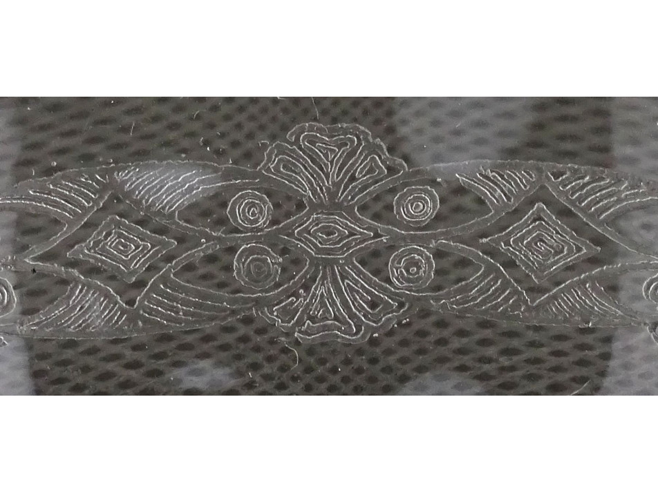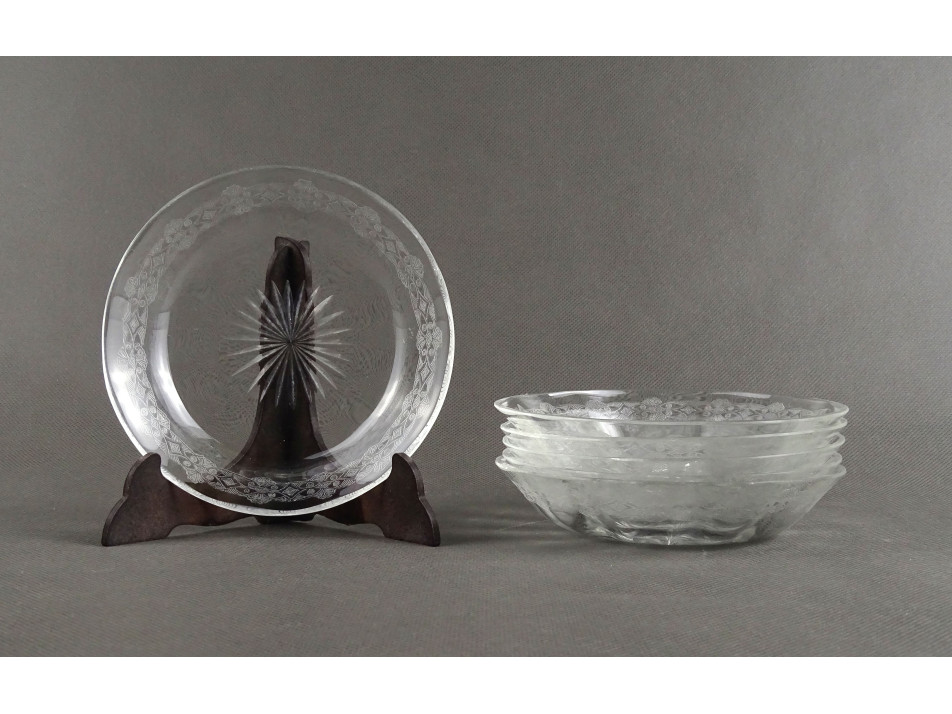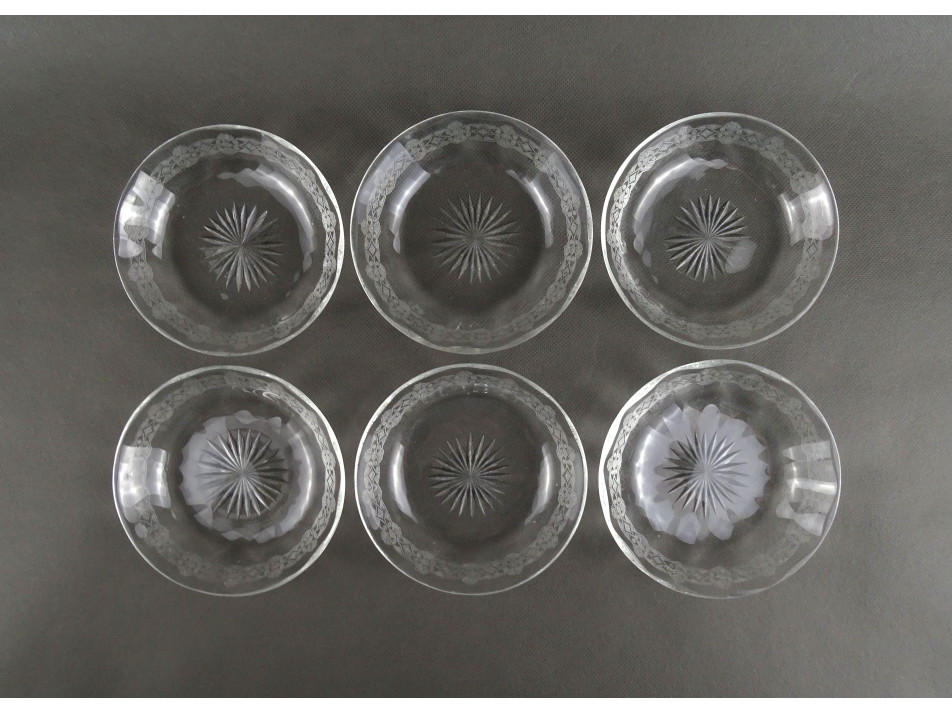 Antik hibátlan állapotú maratott és csiszolt üveg süteményes tányér készlet 6 darab