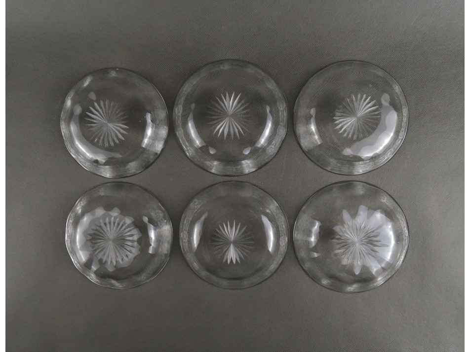 Hibátlan állapotú, 6 darabos üveg süteményes tányér készlet az oldalán maratott a talpán csiszolt díszítéssel.