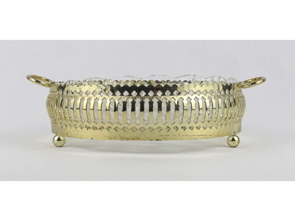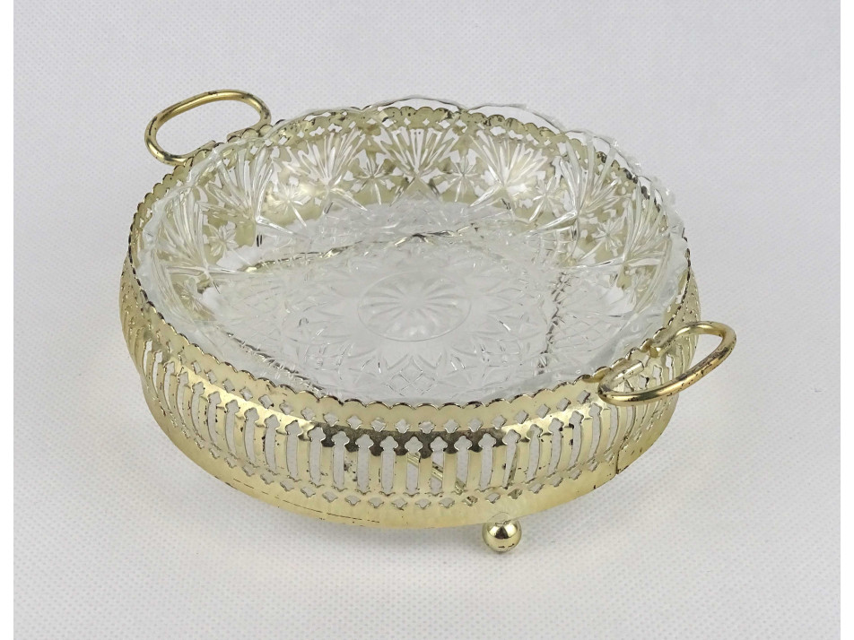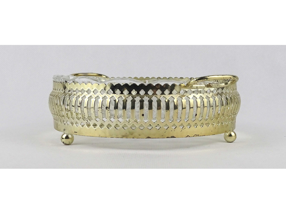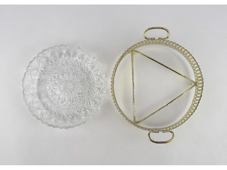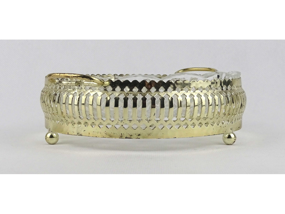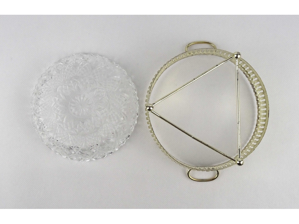 Hibátlan állapotú, ezüstözött füles fém keretbe foglalt üveg kínálótál, kis tál.