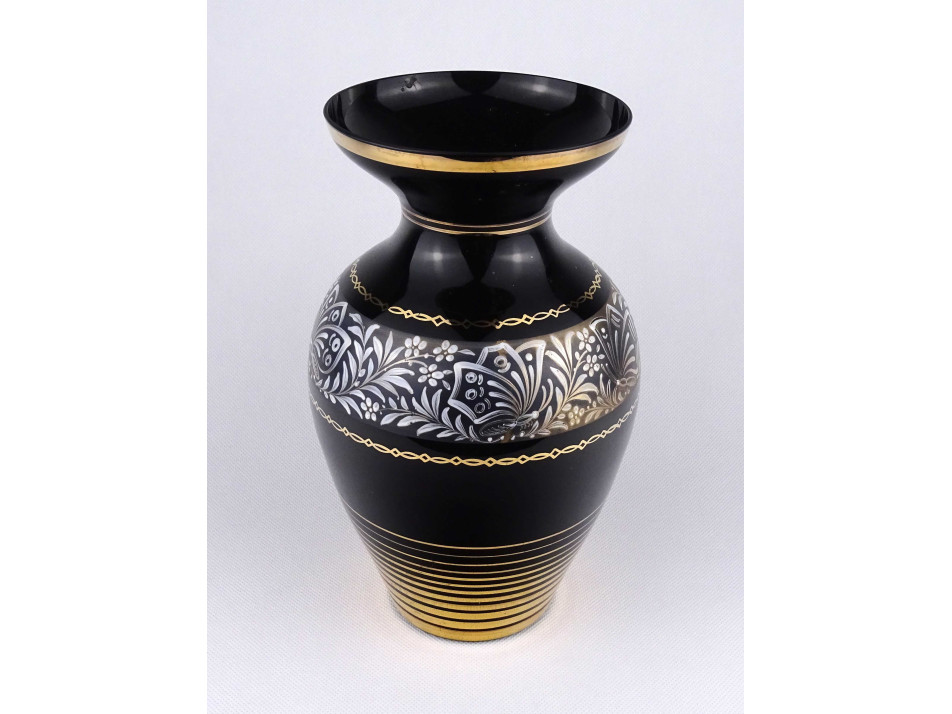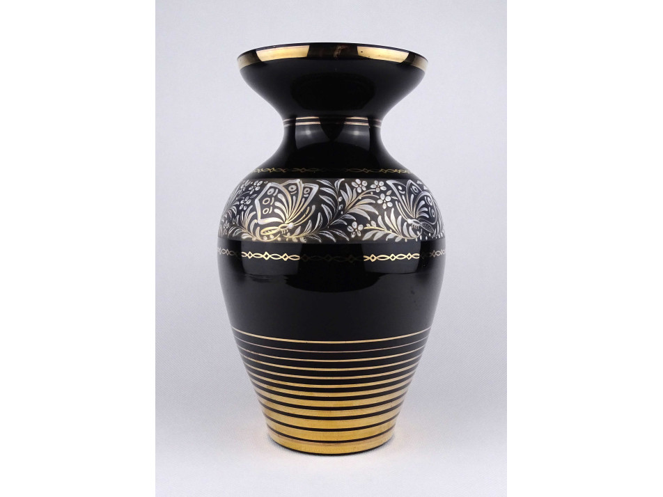 Régi, hibátlan állapotú, nagyméretű, fekete színű , aranyozott üveg váza, díszváza. Felülete arannyal és kézi festésű pillangós-virágos mintákkal díszített.