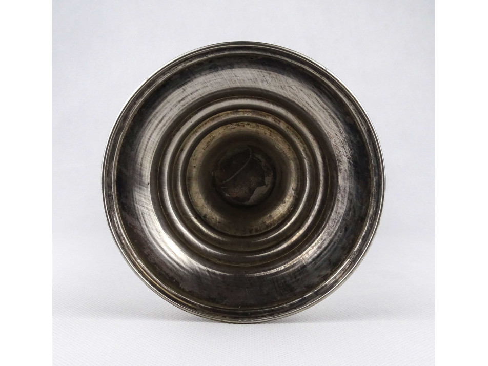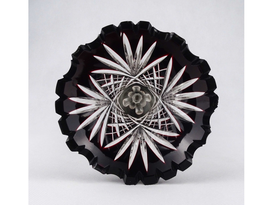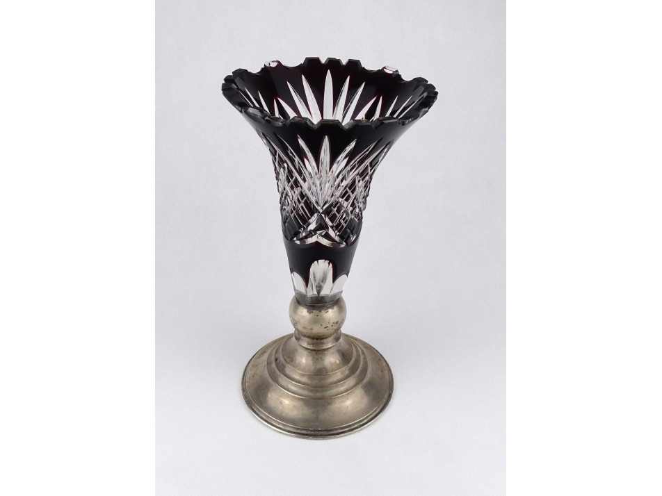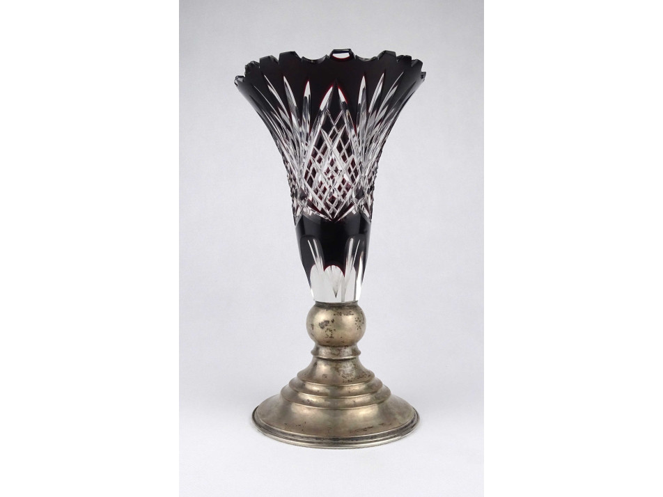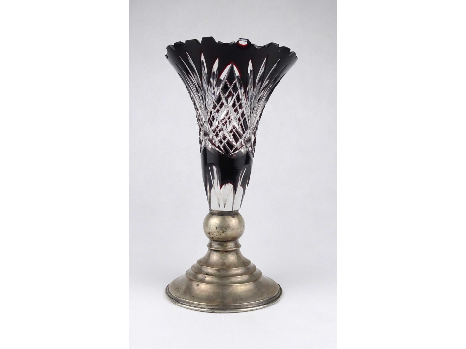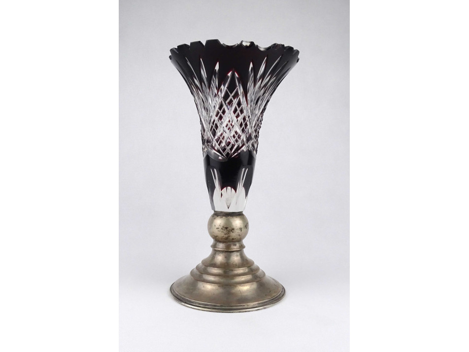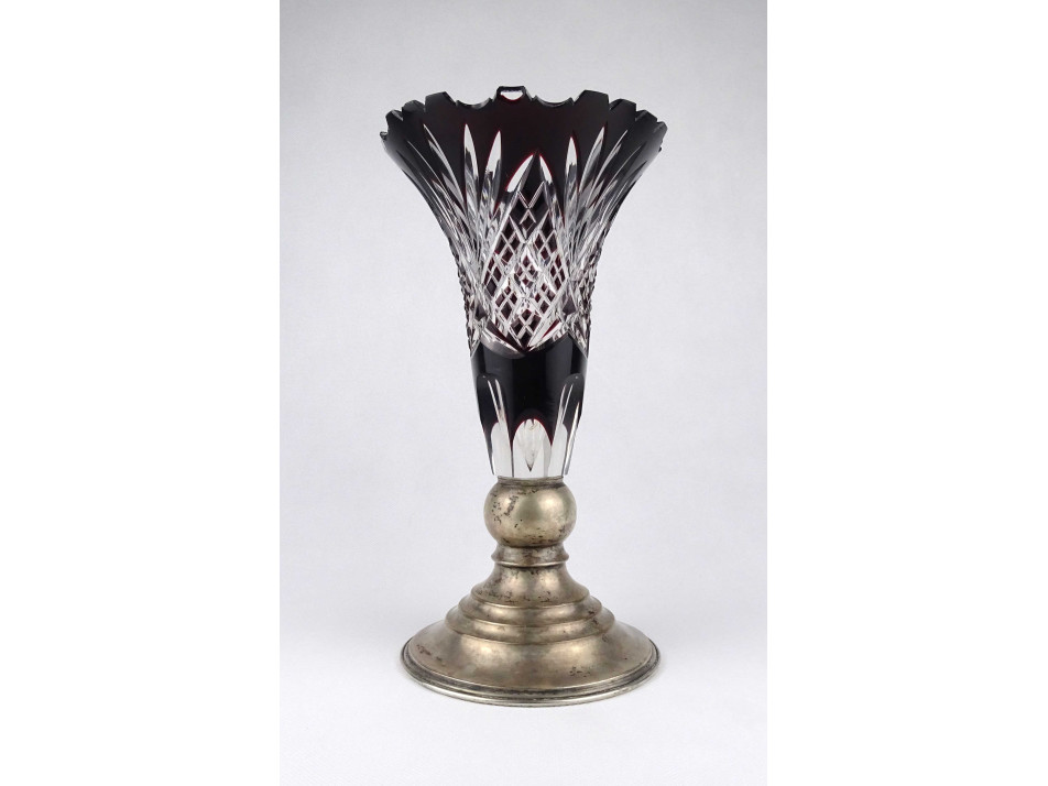 Szép állapotú, csiszolatokkal gazdagon díszített, bordóra színezett vastagfalú kristály váza, ezüstözött alpakka talpon. A váza felső peremén néhány apró lepattanás látható.