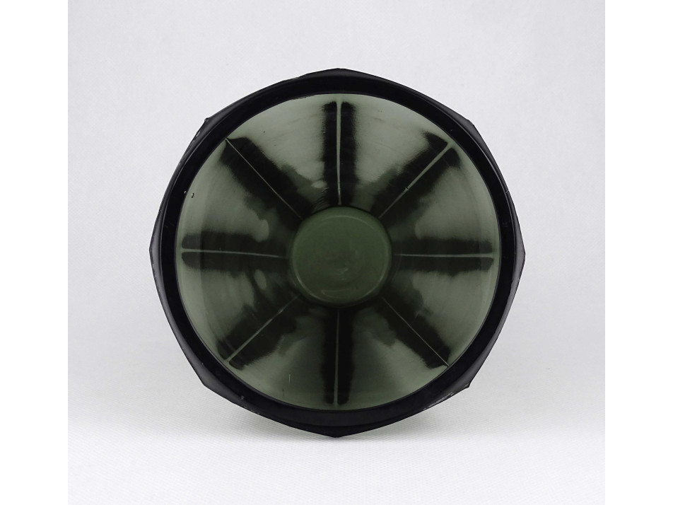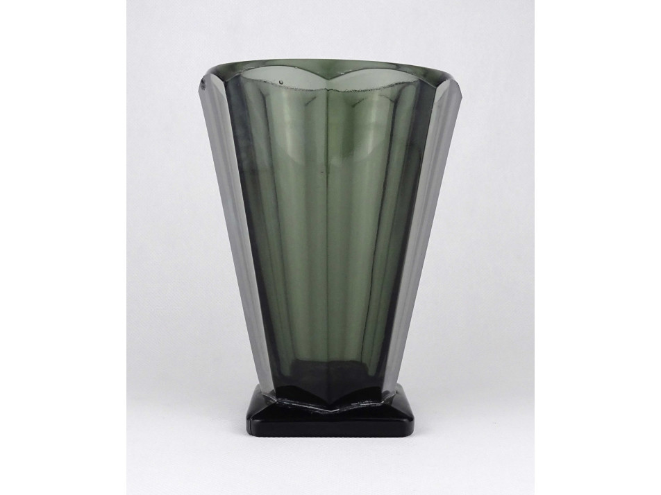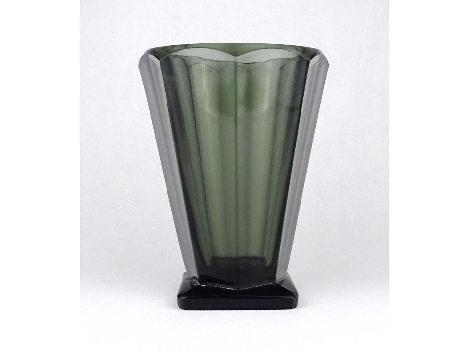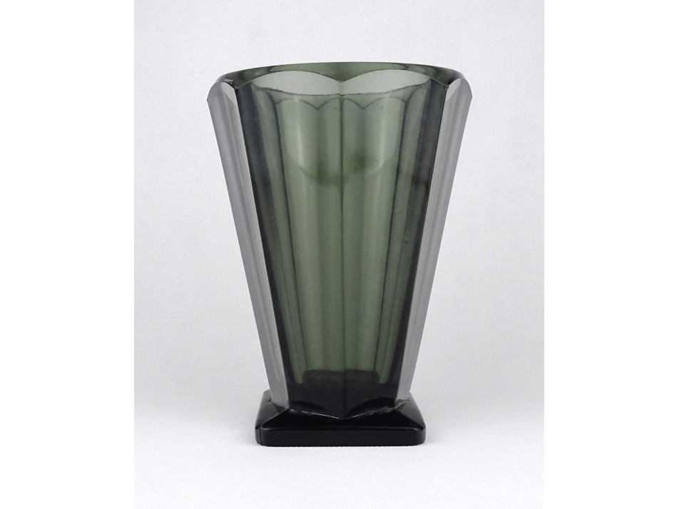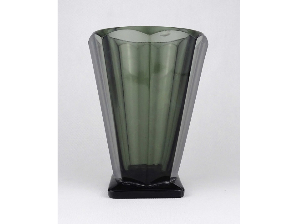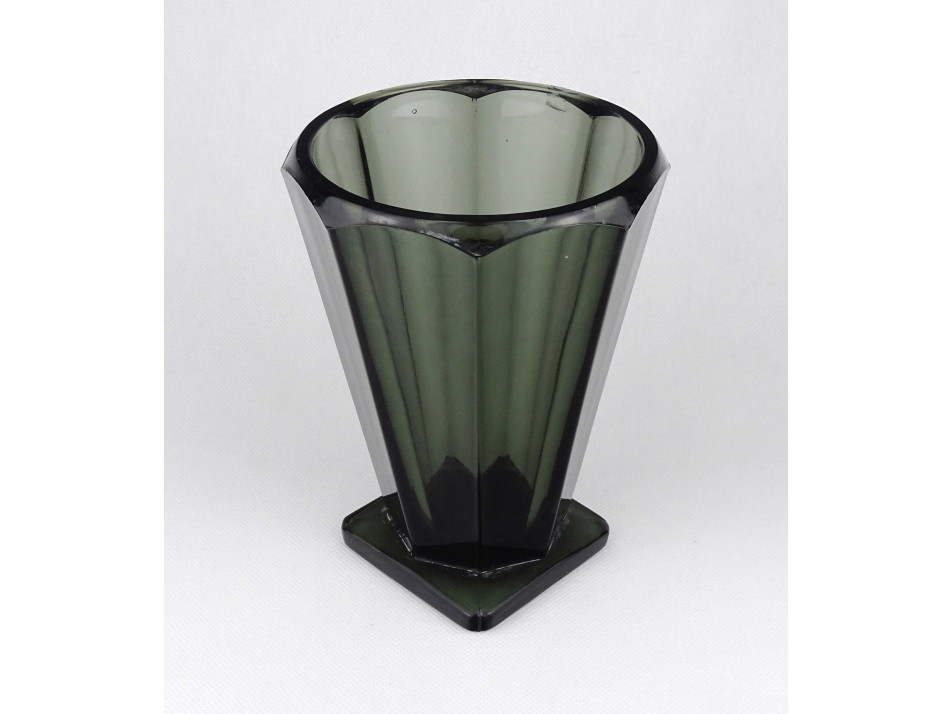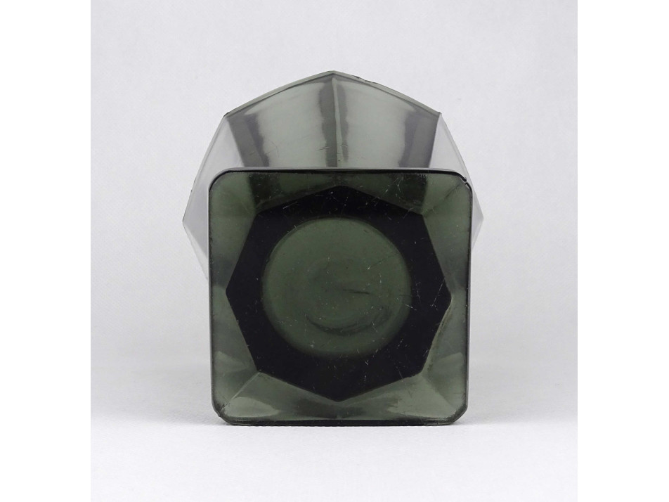 Régi, szép állapotú, vastagfalú, szabályos síklapokból álló, nyolcszögletű, füstszínű üveg design váza, díszváza. A váza felső peremén kívülről egy apró lepattanás látható.