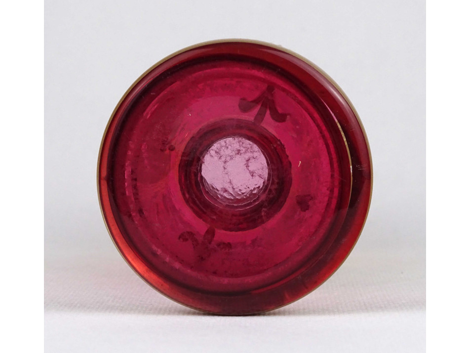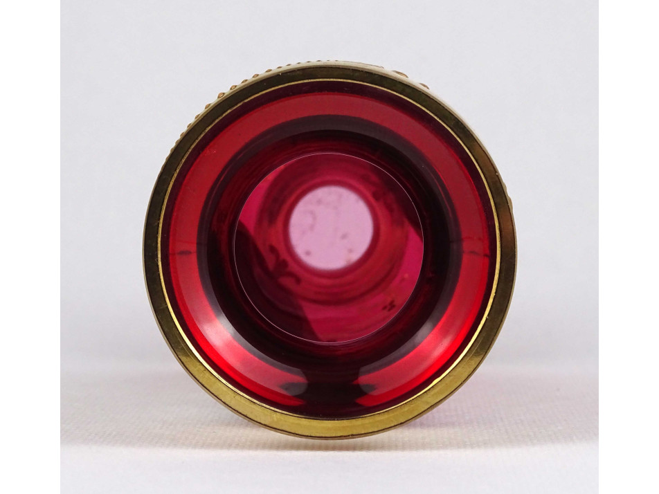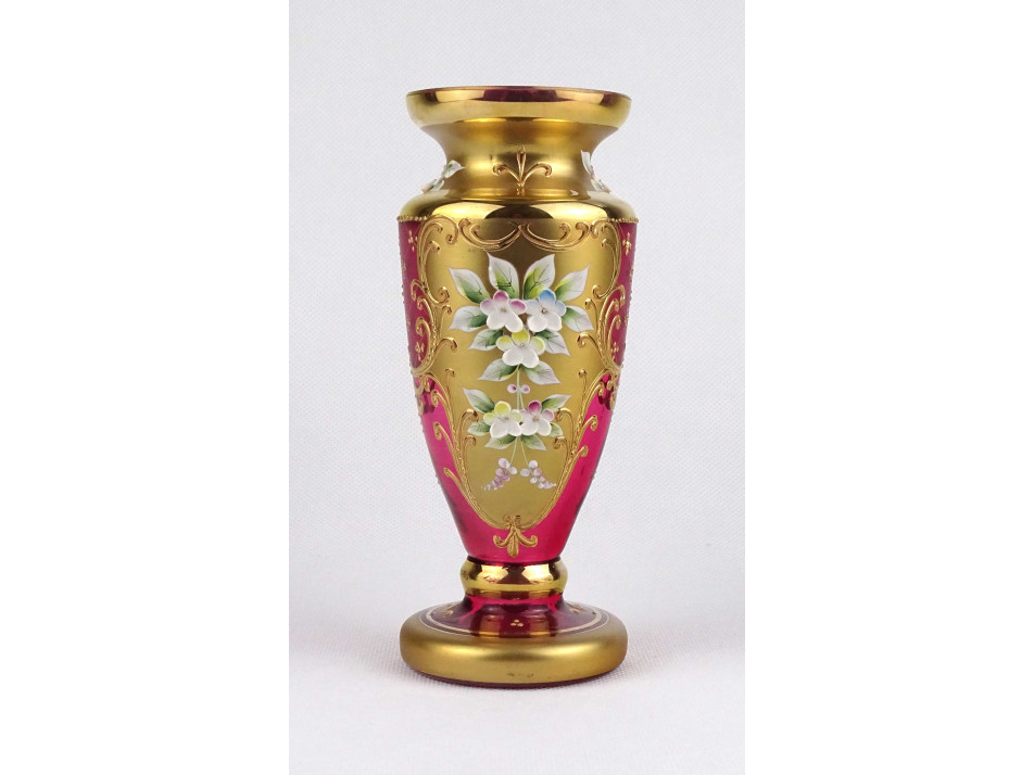 Hibátlan állapotú, talpas, bordó színű, dúsan aranyozott, domború virágmintás Bohémia üveg díszváza, rajta plasztikus virág mintákkal.