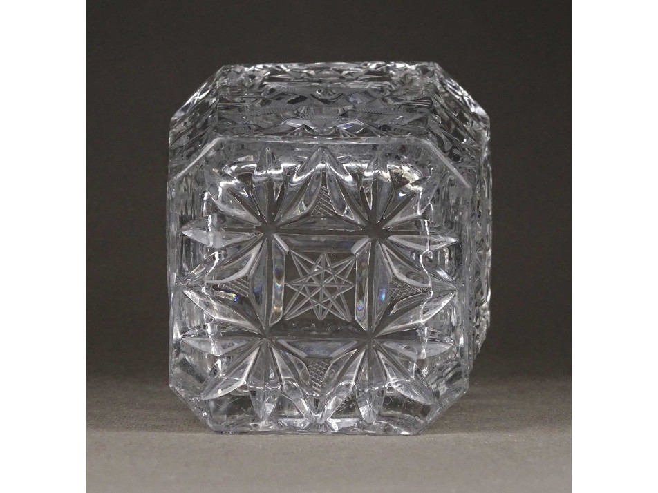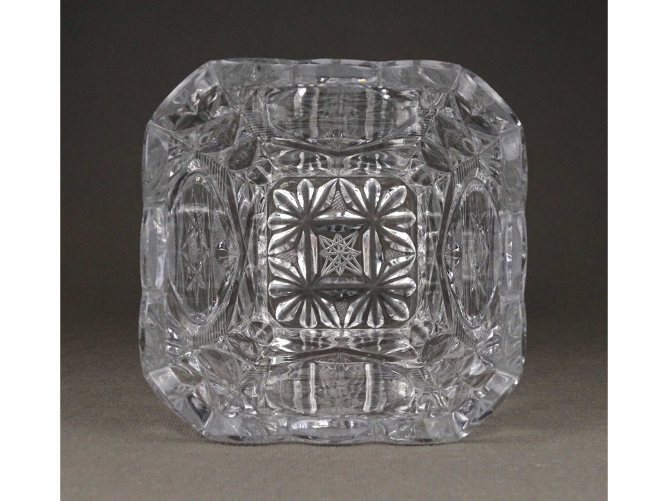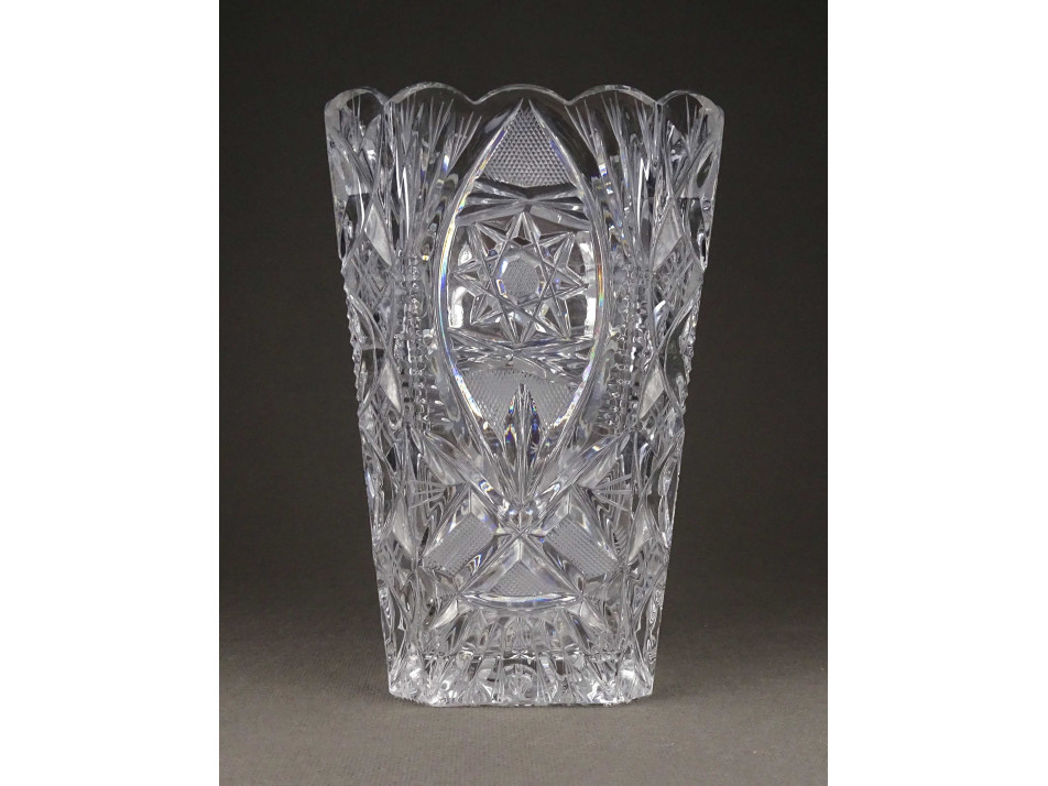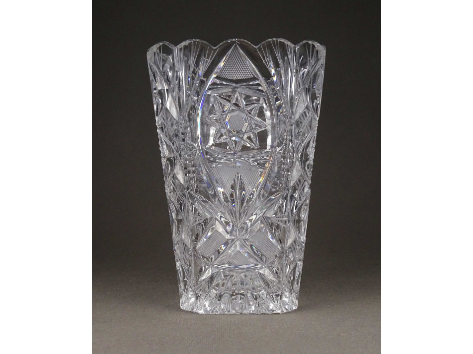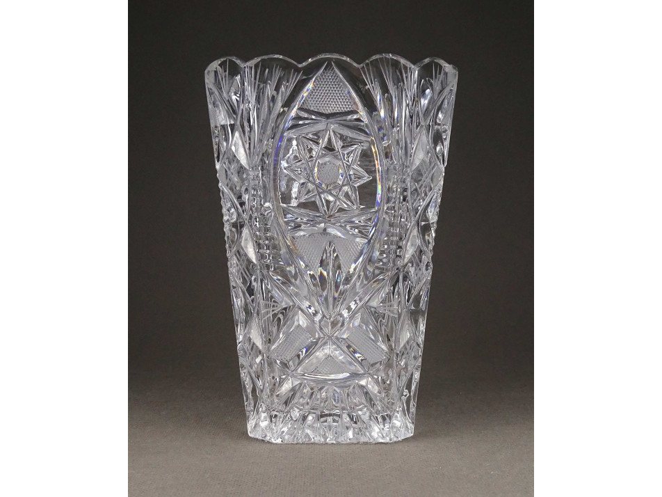 Hibátlan állapotú, gazdagon díszített, szögletes alakú, csiszolt kristályváza, virágváza, díszváza.