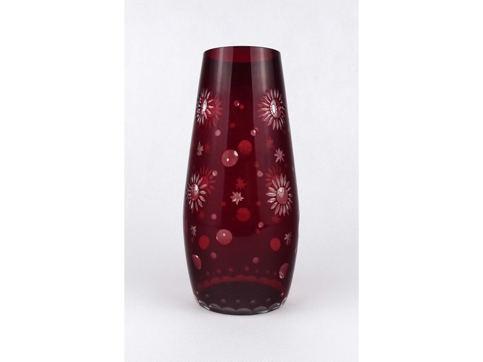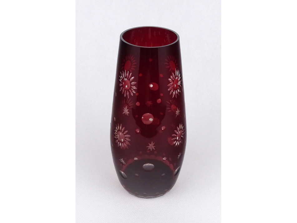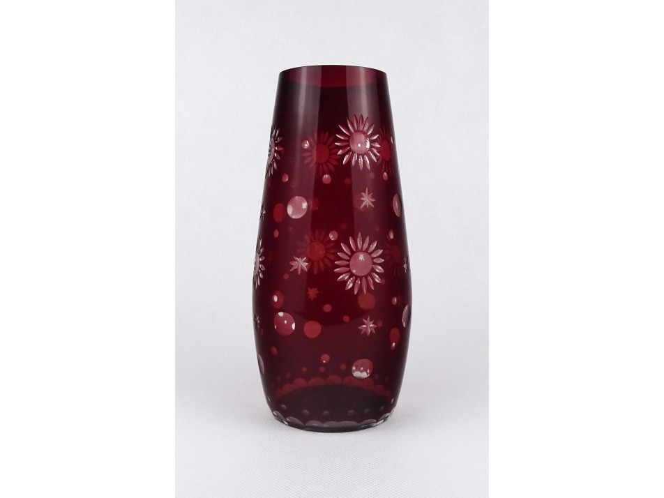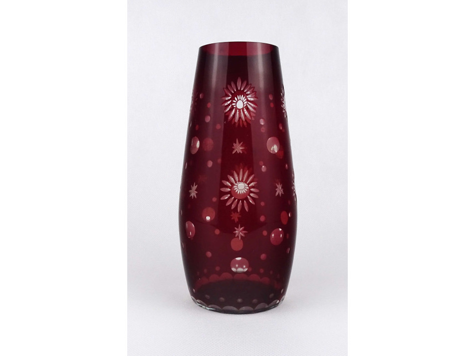 Hibátlan állapotú, nagyméretű, bordóra színezett, csiszolt virág vagy csillag mintákkal díszített, vékonyfalú, fújt üveg váza, virágváza.