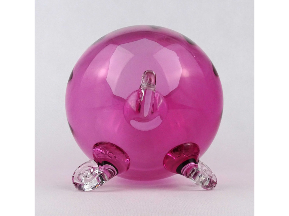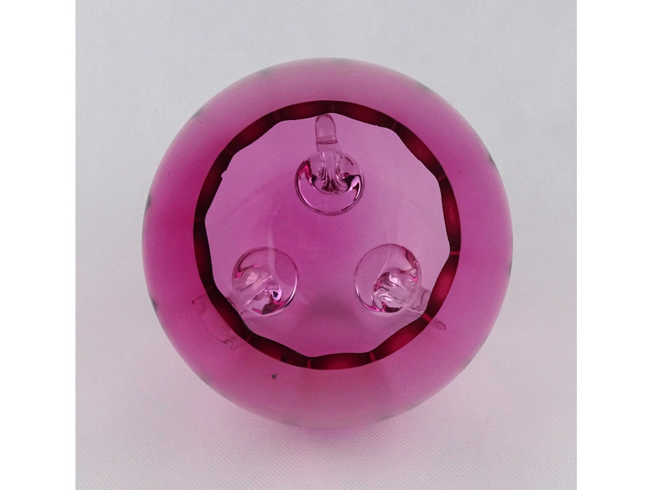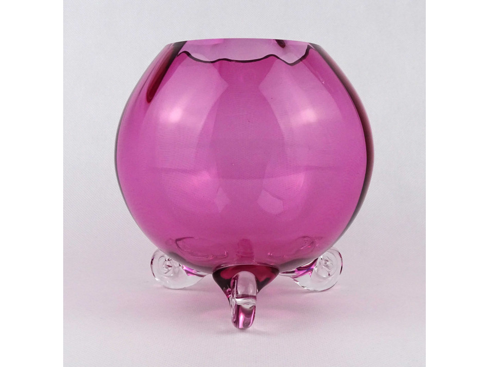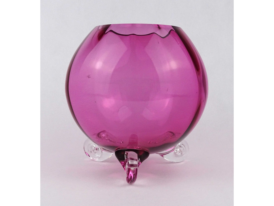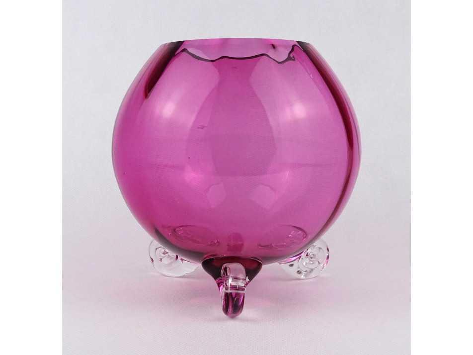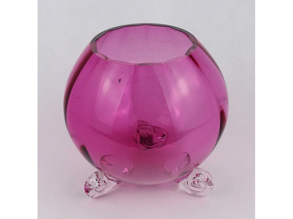 Régi, szép állapotú, három csigalábon álló, rózsaszín, belülről bordázott üveg gömbváza, díszváza. Belső peremén egy apró lepattanás látható.