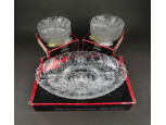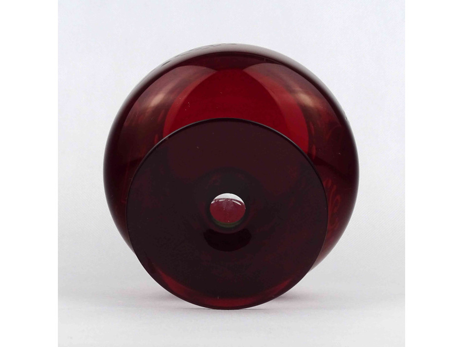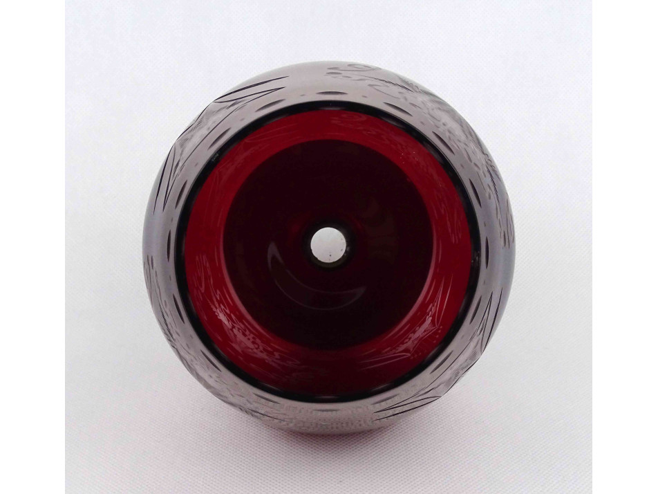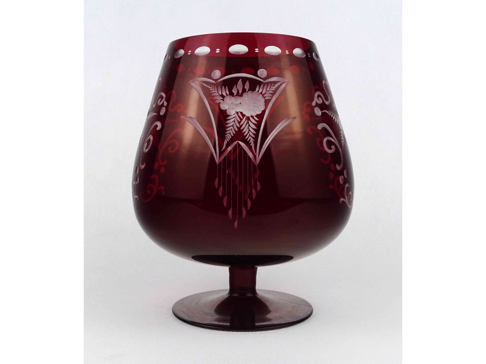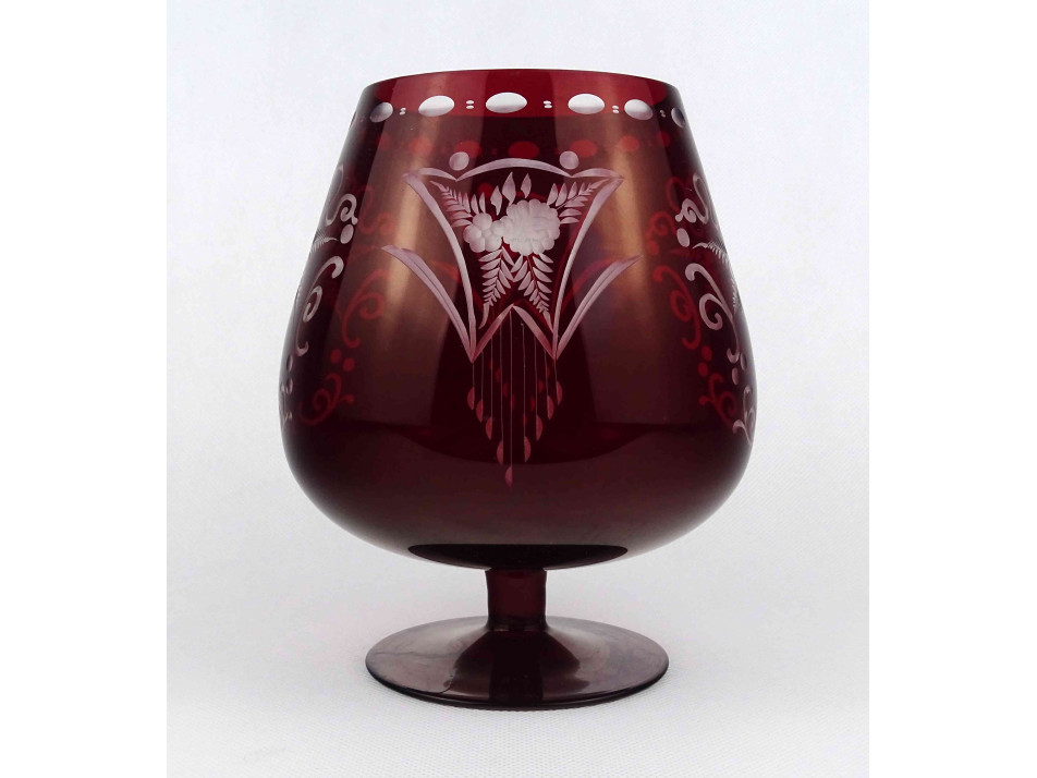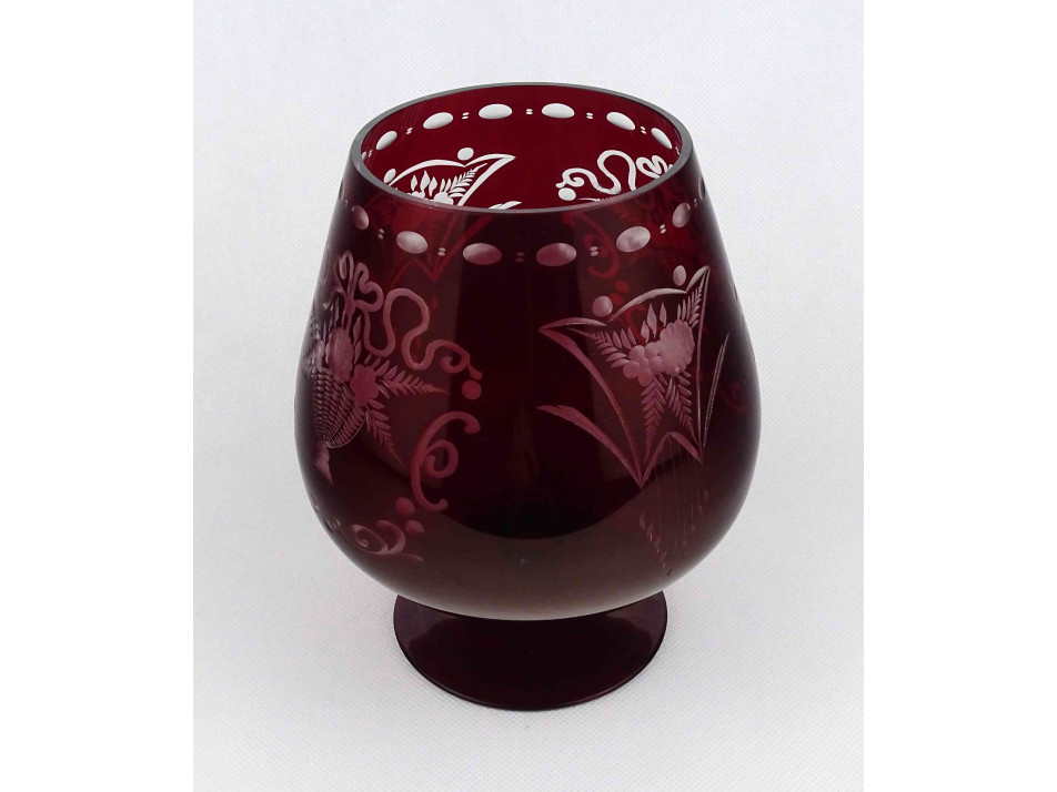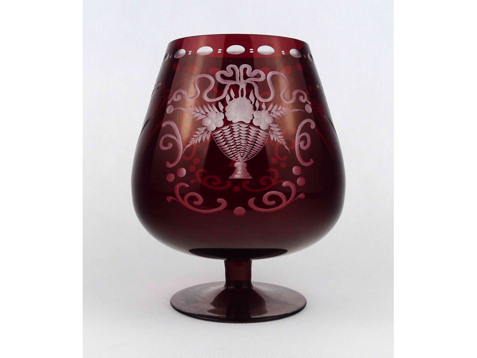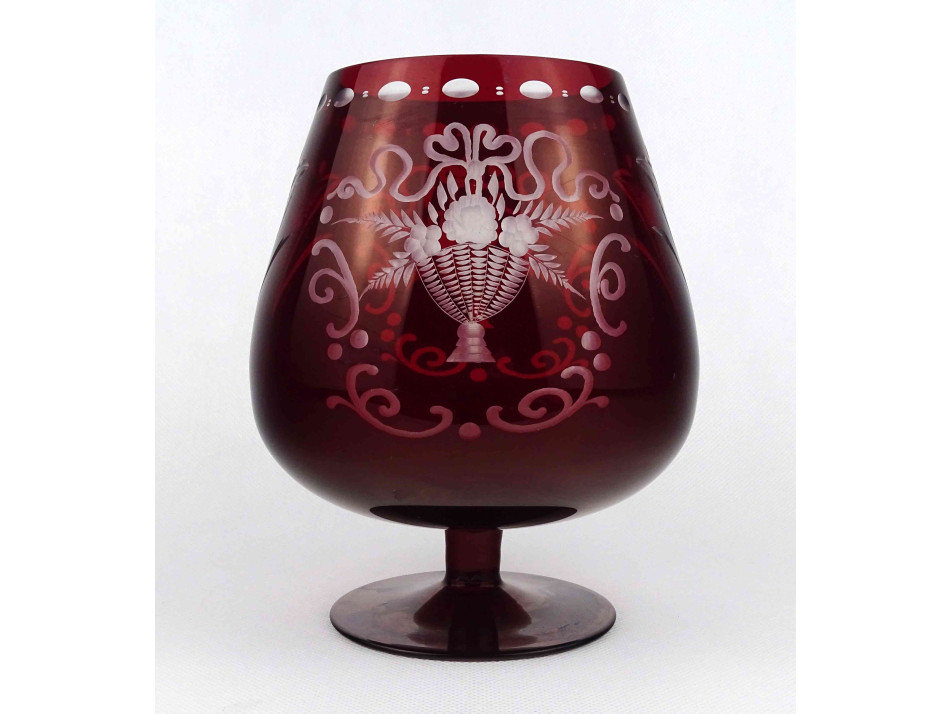 Régi, hibátlan állapotú, bordó, csiszolt, kristály talpas kehely, öblös dísz váza. Oldalán aprólékos virágkosár motívumos csiszolt díszítés.