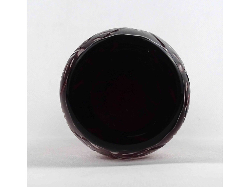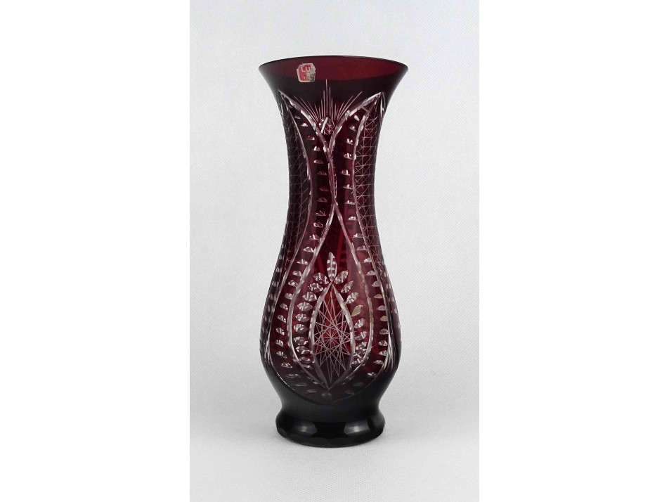 Régi, hibátlan állapotú, csiszolatokkal gazdagon díszített, vékonyfalú, anyagában bordóra színezett kristály váza, díszváza.
