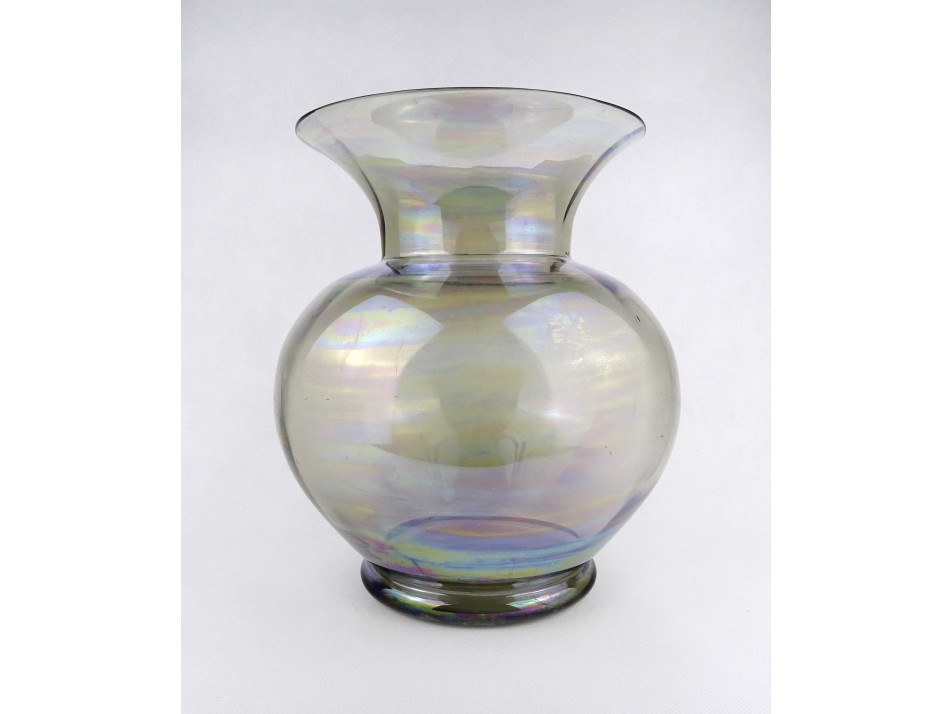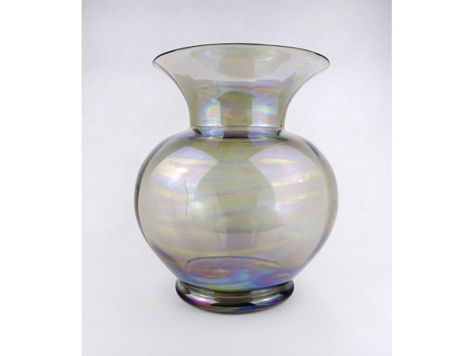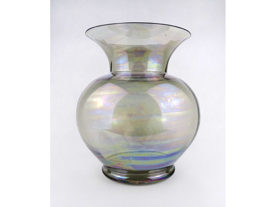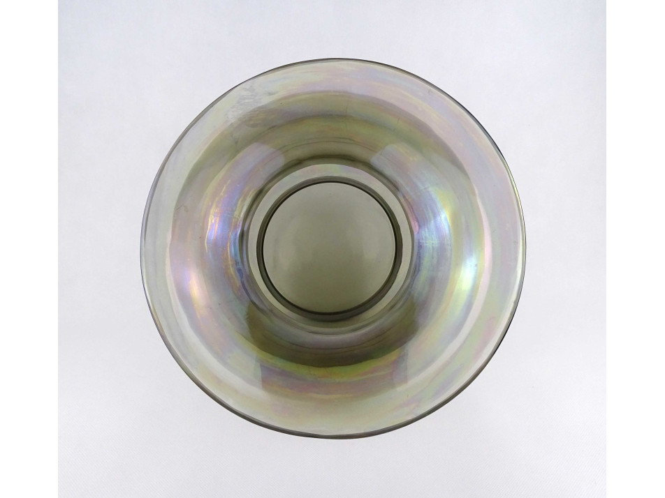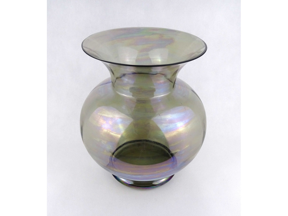 Nagyméretű, szép állapotú, irizáló, füst színű fújtüveg díszváza, design váza. Gömbszerűen öblös, belülről bordázott művészi üveg váza.