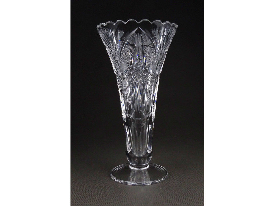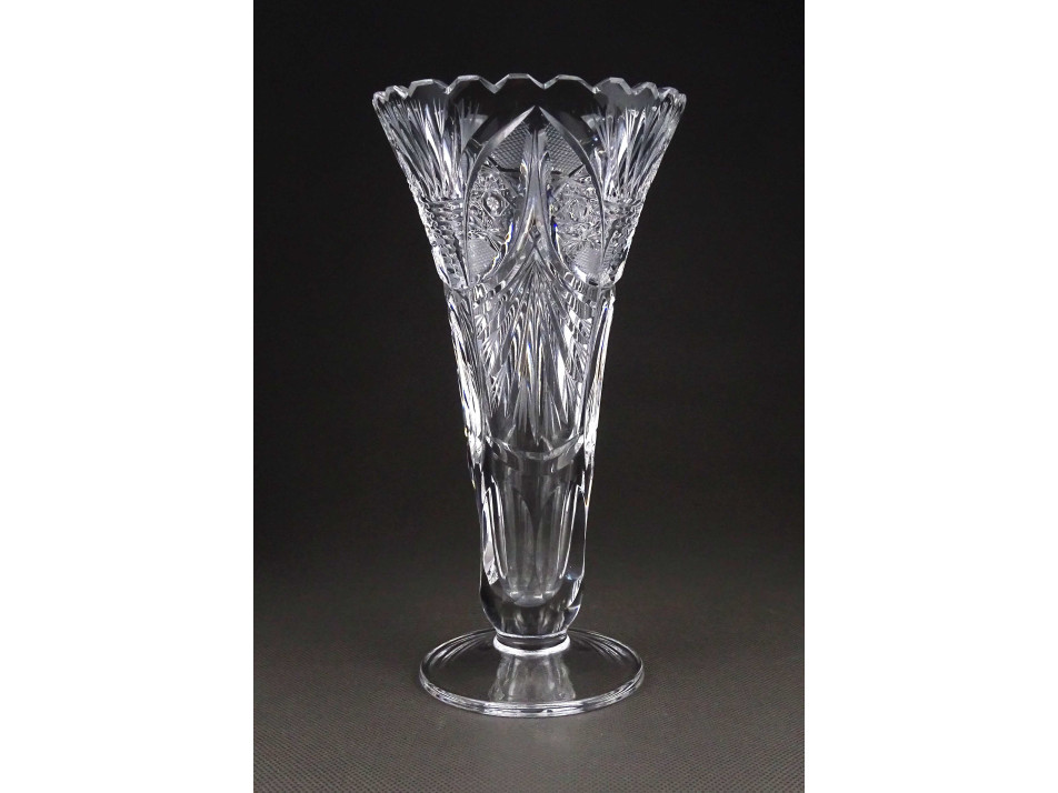 Régi, hibátlan állapotú, oldalán csiszolatokkal díszített talpas kristályváza, díszváza.