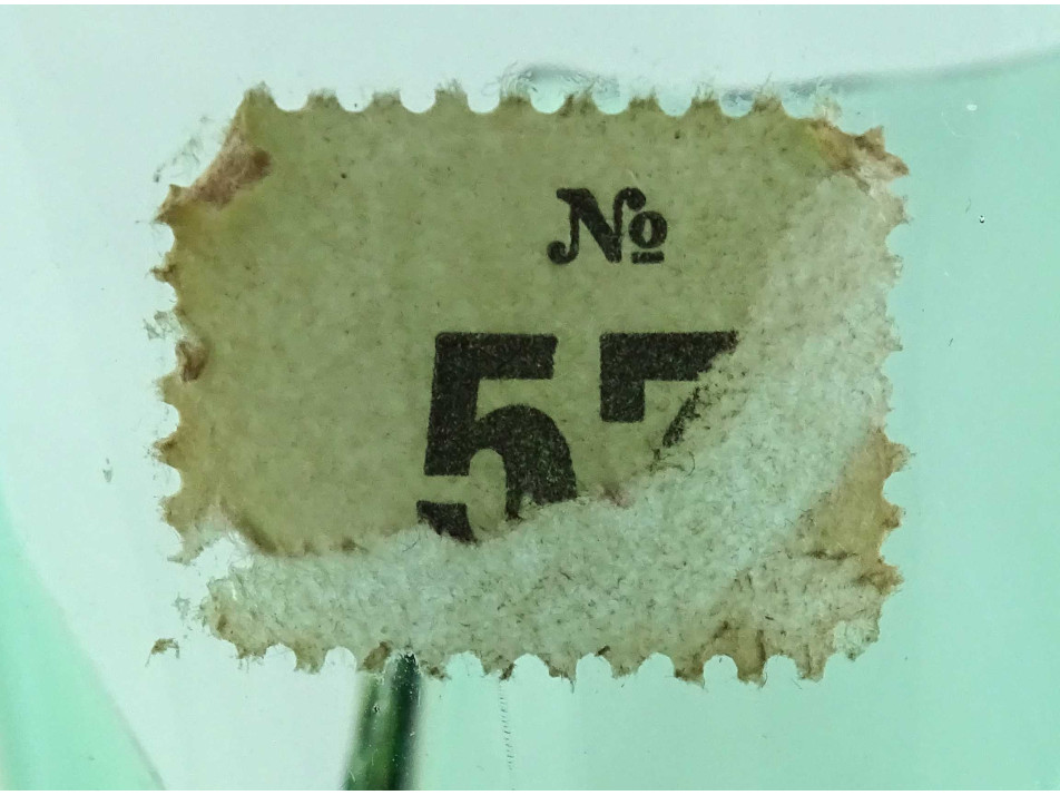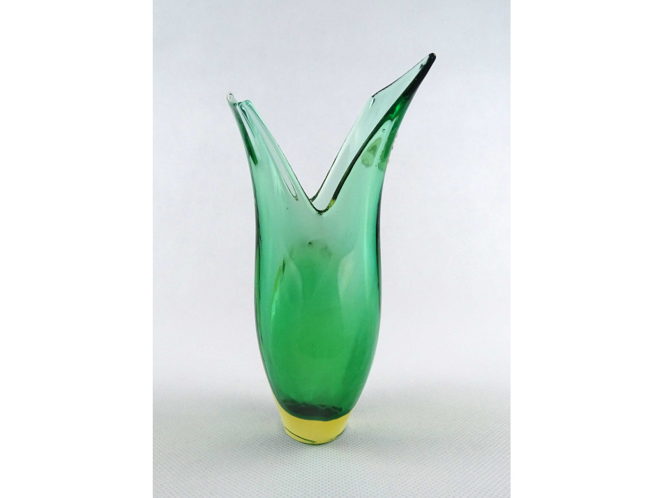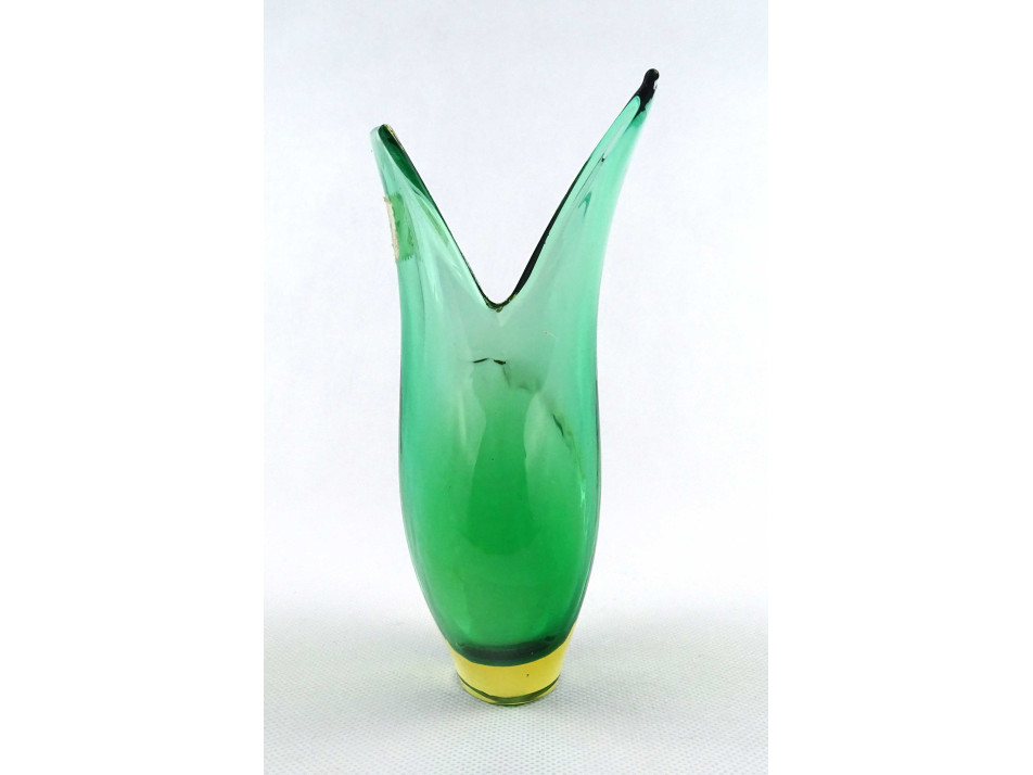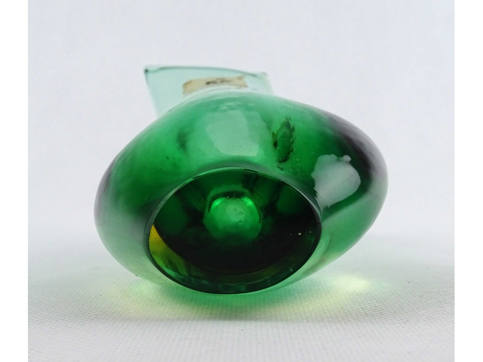 Hibátlan állapotú, vastag falú, zöld színű, művészi, cseh fújt üveg sommerso váza XX. század második feléből. Nyakán kereskedői etikett címke töredék.