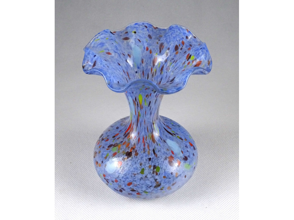 Régi, hibátlan állapotú, több színű, anyagában színezett, öblös testű, fodros szájú fújtüveg szálváza, virágváza. Alap színe a világos kék, emellett narancs, vörös, lila és fehér színekben játszik. Alján látható a fújás és szakítás nyoma.