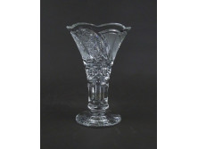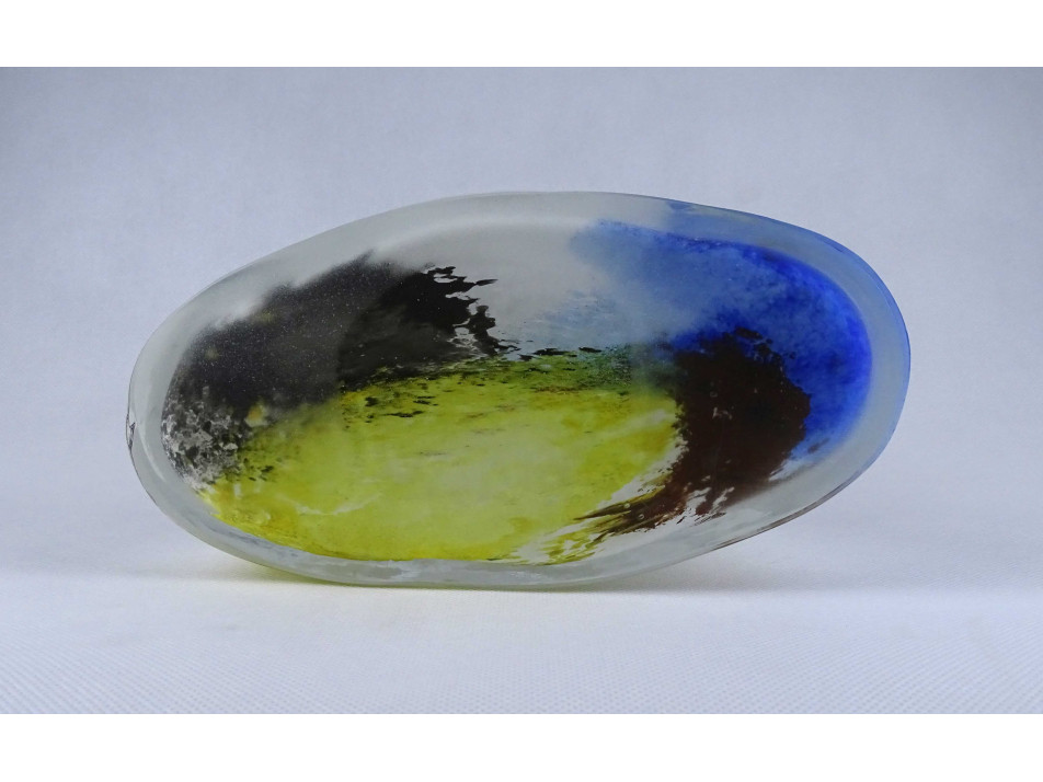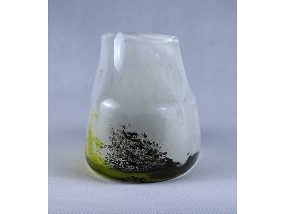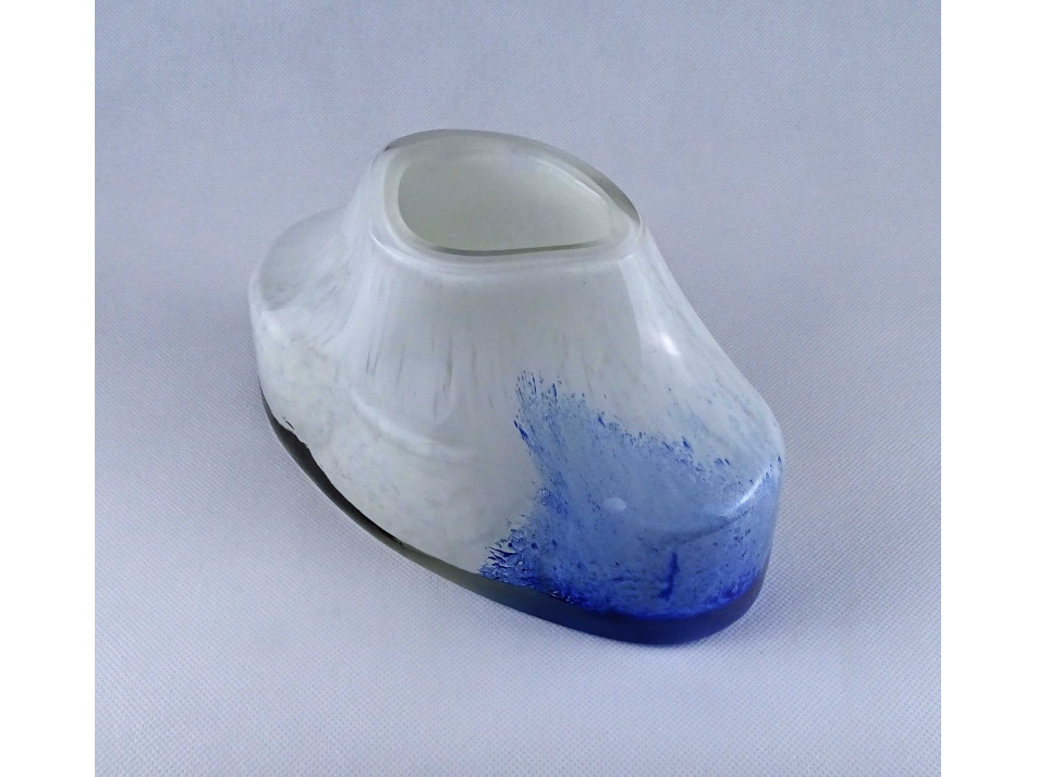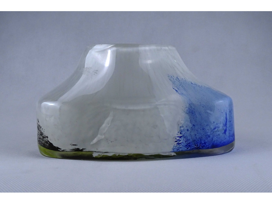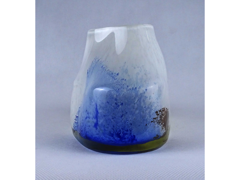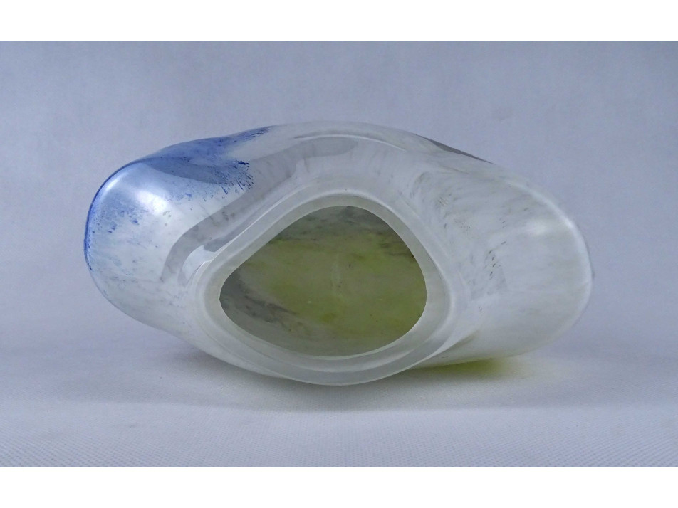 Hibátlan állapotú, anyagában színezett, fehér - sárga - kék, művészi rétegelt üveg váza. Öblös testű fújtüveg design váza, díszváza.