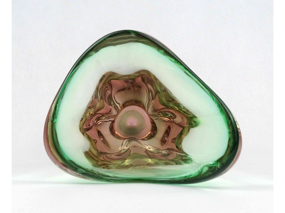 Nagyméretű zöld és borostyán színű cseh sommerso BOHEMIA művészi üveg hamutál 23 cm