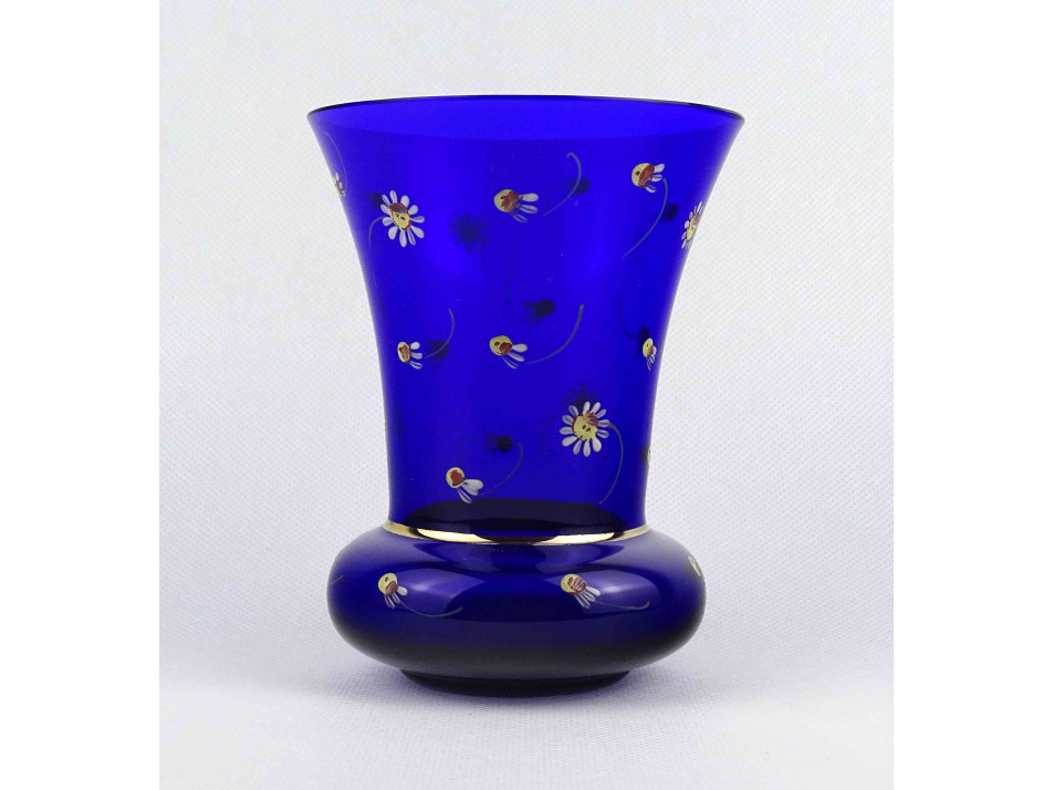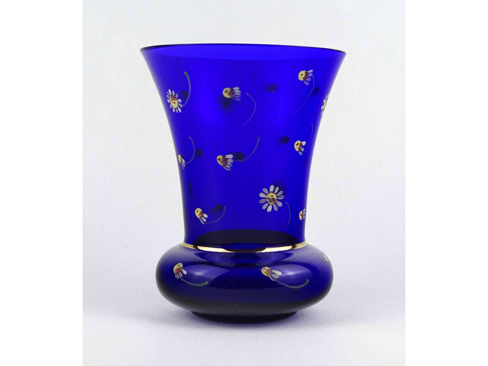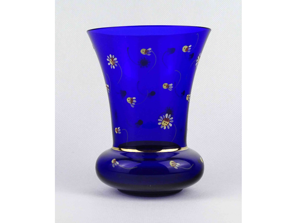 Gyönyörű kobaltkék, királykék színű, apró virágokkal díszített, kézzel festett parádi üveg váza, díszváza.
