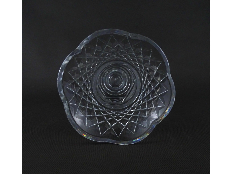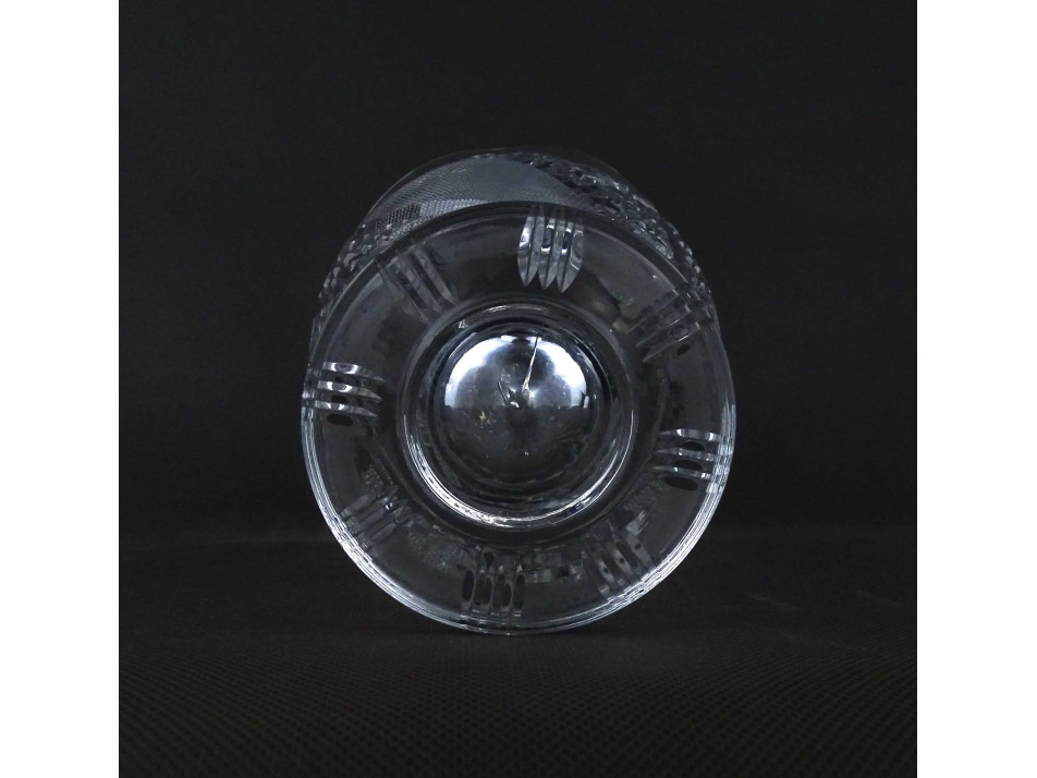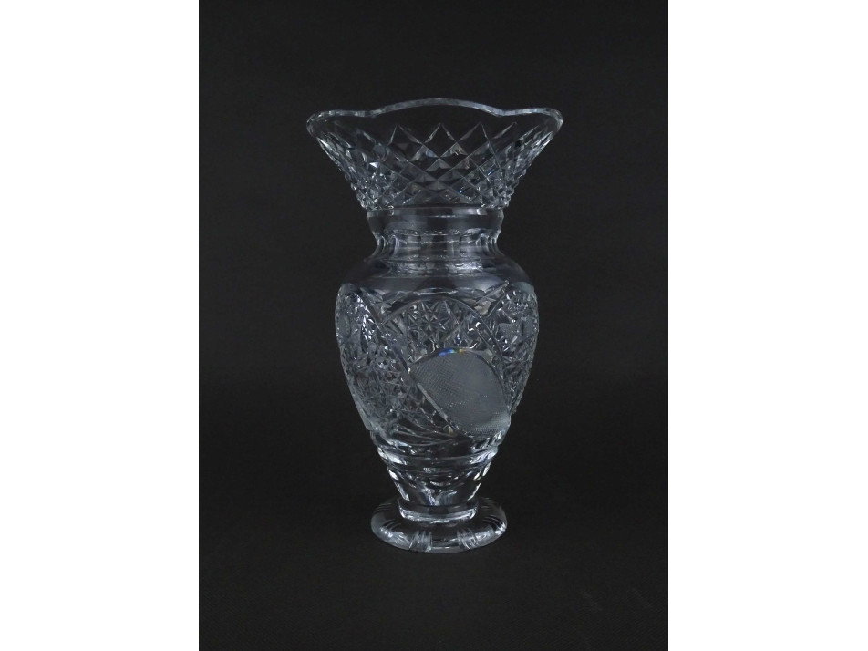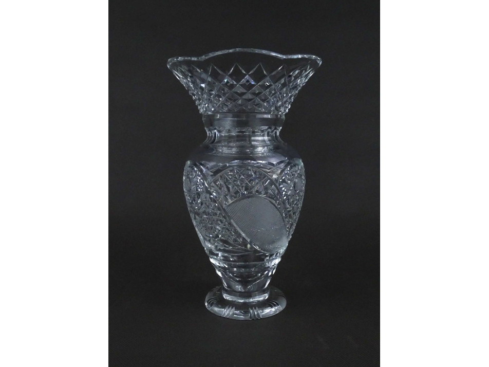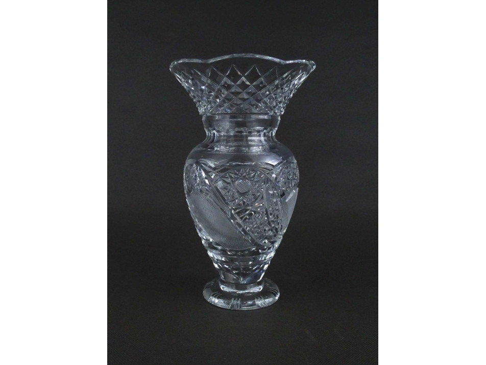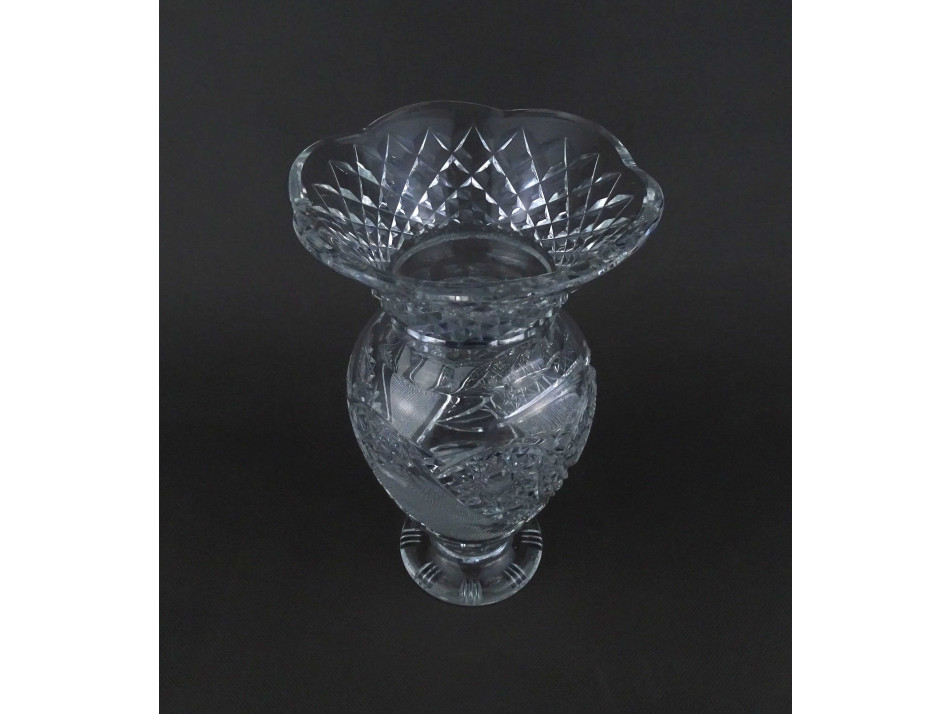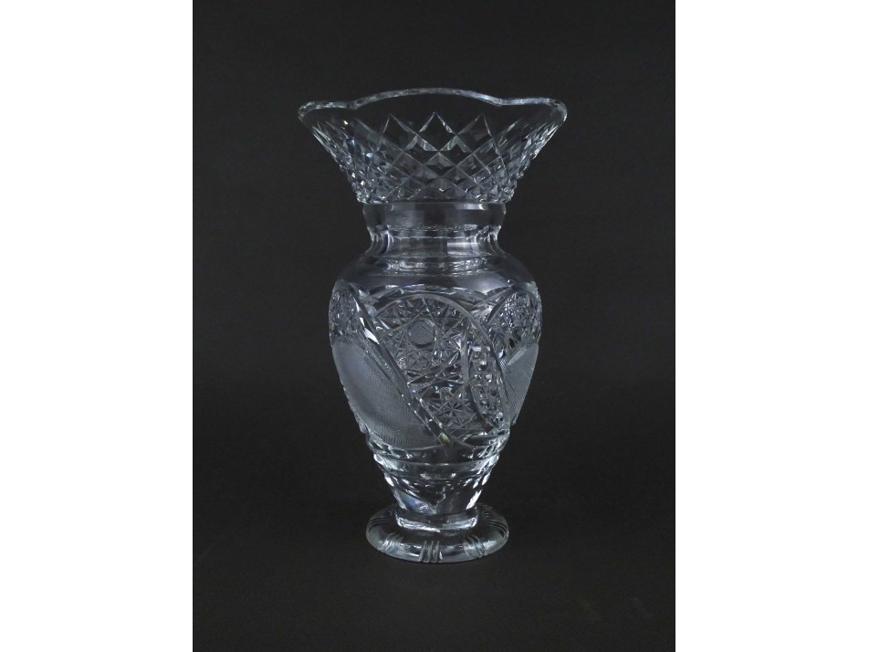 Régi, szép állapotú, csiszolatokkal gazdagon díszített, vastagfalú, öblös kristály váza, díszváza. A váza belsejében, az alján apró, valószínűleg a gyártás során keletkezett repedés látható.