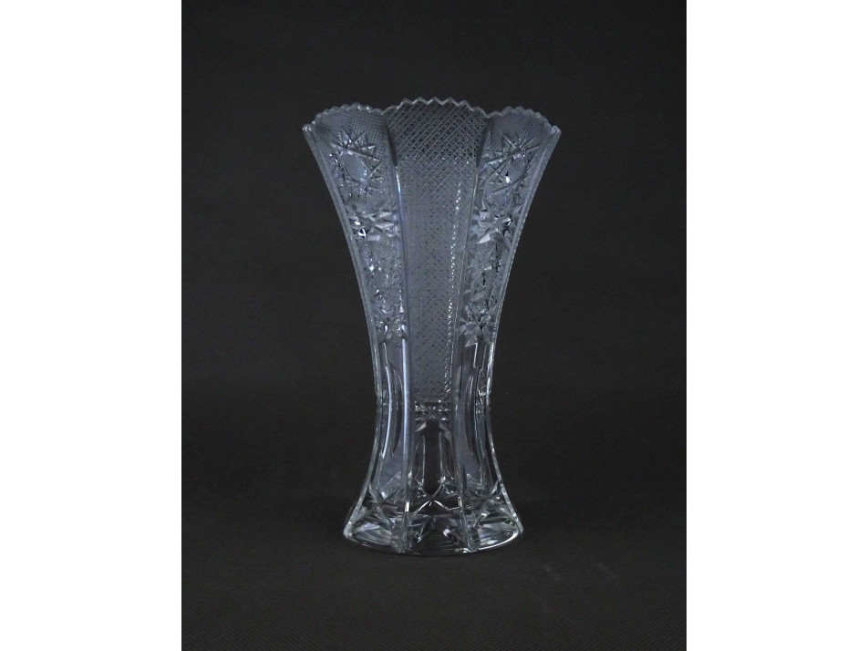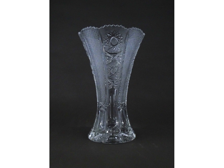 Régi, hibátlan állapotú, csiszolatokkal gazdagon díszített üveg váza, kristály váza, virágváza.