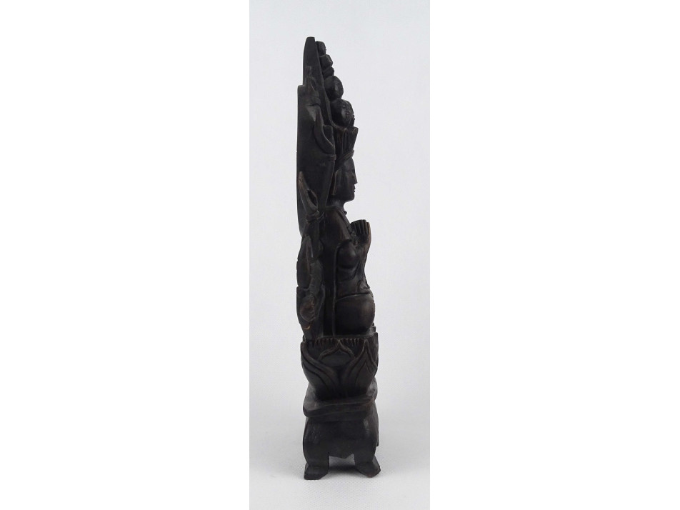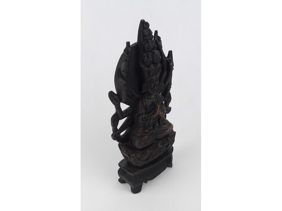 Szép állapotú, egzotikus keményfából faragott, távol-keleti, buddhista istenség Bráhma szobor, lótusz ülésban meditáló nyolckarú, sokfejű istenalak.