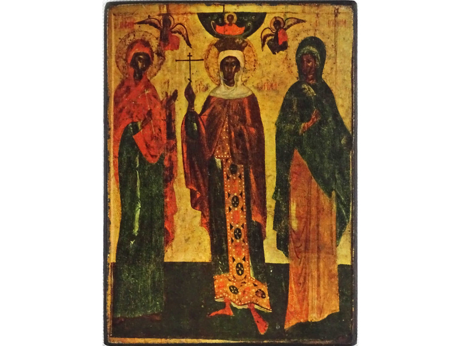 Hibátlan állapotú ikon másolat, fatáblán, falra akasztási lehetőséggel. A képen látható három női alak a következő: